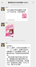 强化服务引领,聚焦疫情防控。在开展防疫工作期间,根据疫情防控需要和妇女需求,大力开展线上群众性宣传教育活动。每日在微信公众平台发布疫情最新动态和妇联工作情况,发出《兴安盟妇联倡议:在打赢疫情防控阻击战中贡献巾帼力量》倡议书,开设“抗击疫情 巾帼行动”“巾帼助力复工复产”等专栏。妇联执委通过微信群、网络直播等方式,线上开展防控知识宣传、技能培训、心理疏导,指导妇女群众科学防护、居家隔离,为打赢疫情防控阻击战贡献力量。全盟各级妇联组织在各平台共发布防疫有关工作信息793条,影响人数28.16万人次。