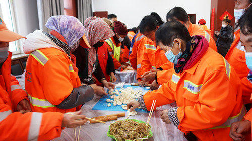 环卫工人围在桌前一边说说笑笑叙着家常,一边吃着热气腾腾的饺子,你一言我一语,浓浓的暖意随着饺子的阵阵香味弥漫在空气中。热腾腾的饺子驱散了冬日的严寒,也温暖着在场的每一个人。