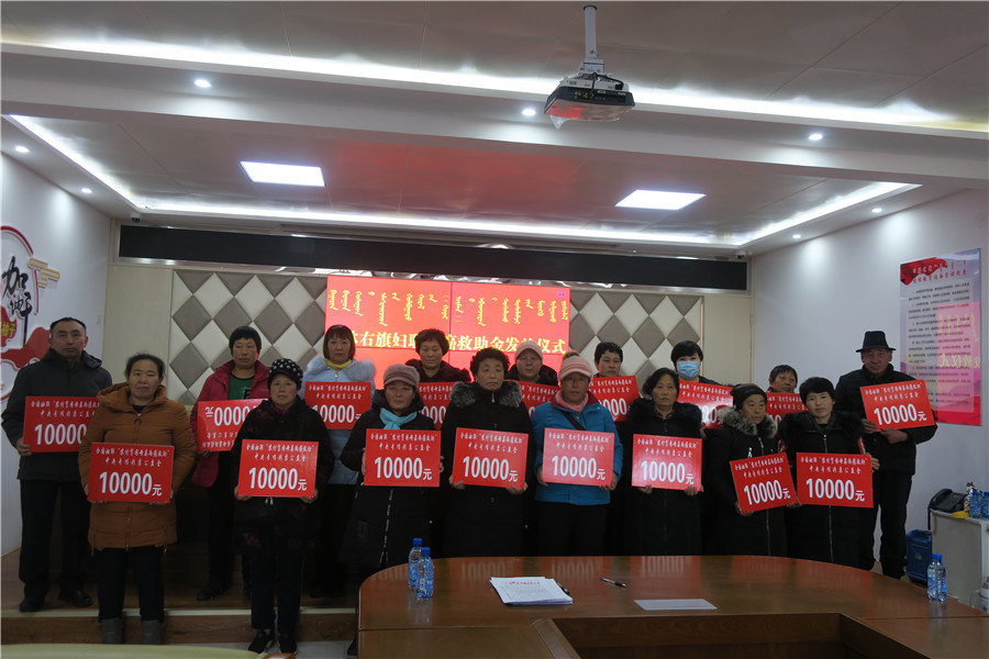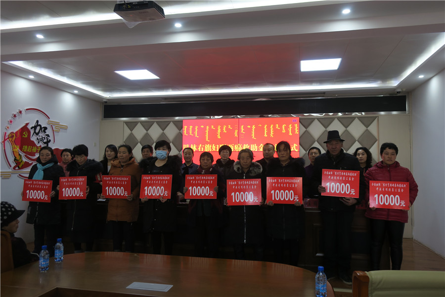 会议上为巴林右旗17名患两癌(妇女宫颈癌、乳腺癌)贫困妇女发放了由全国妇联、中央彩票公益金(中国福利彩票和中国体育彩票)提供的17万元救助款,每人救助了1万元。